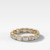 An eternity style band featuring a continuous loop of emerald cut diamonds. Each embraced by their own personal case of gold.